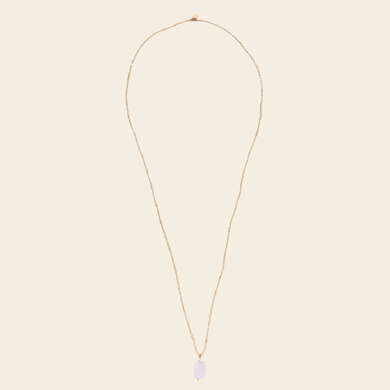 Discover the Calm Rose Quartz Gold Necklace from A Beautiful Story. This handmade necklace features glass beads, gold-plated brass and one large oval rose quartz gemstone. It has a length of 65 centimetres. You can wear this necklace on its own or layer it by combining it with other necklaces from A Beautiful Story.